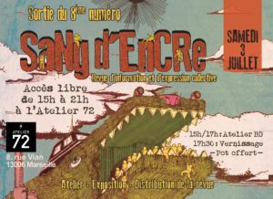 À l’occasion de la sortie du 8ème numéro de SaNg d’EnCRe, auront lieu le samedi 3 juillet 2021 de 15h à 21h à l’Atelier 72 : une expo, un atelier BD… Avec bien sûr la possibilité de lire la revue et repartir avec le nouveau numéro !