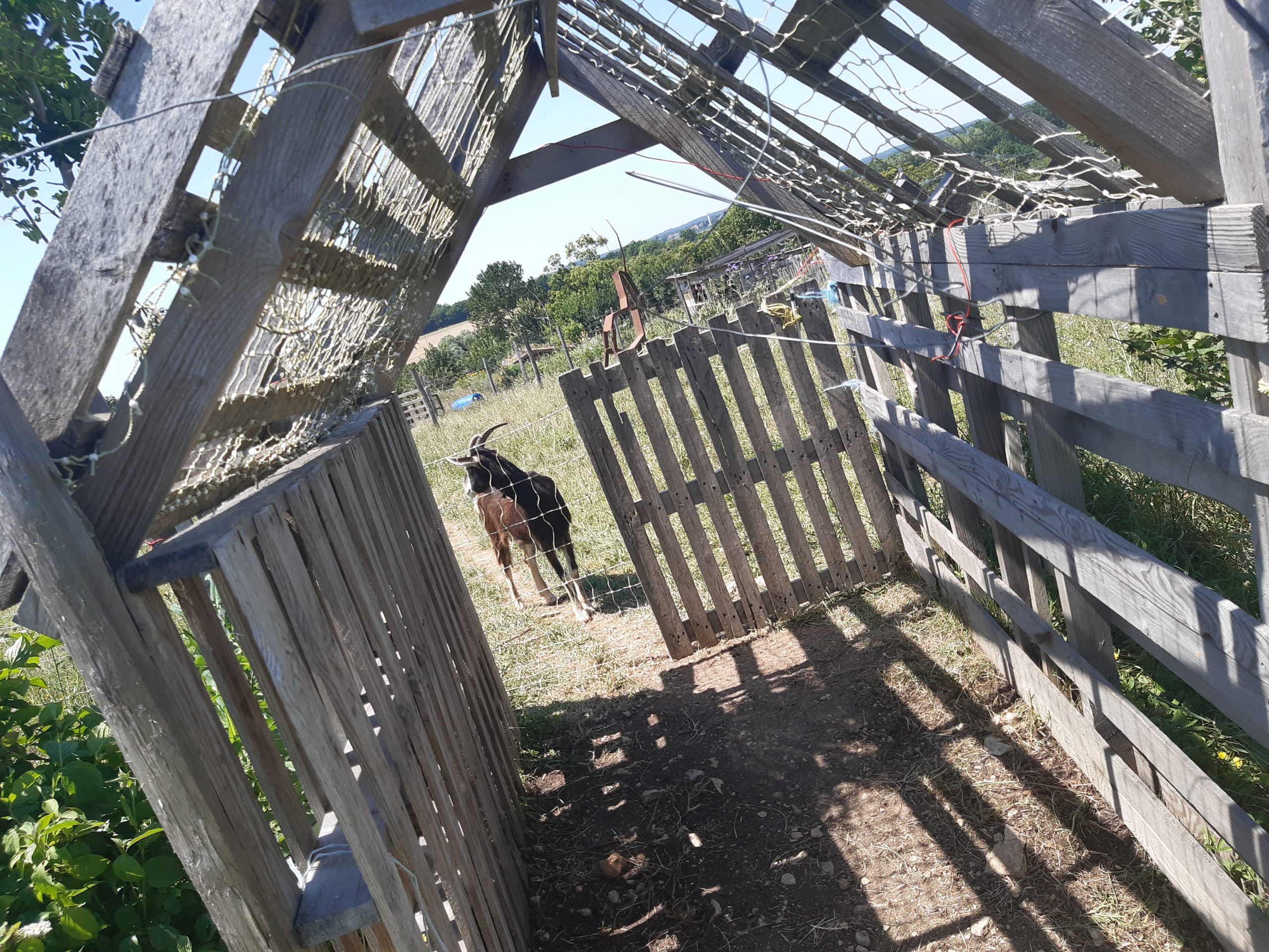 Toujours dans ce domaine car il faut « manger pour vivre et non l’inverse », Monia, Noémie et votre serviteur se chargent d’aller chercher les victuailles et le « sang de la terre », chère expression de Noémie. Au moment d’arriver, des vacanciers viennent découvrir les pensionnaires de la Ferme. Enfants et parents sont envahis de bonheur pour la traite des chèvres, la fabrication des fromages, beurre entre autre. Et du même coup, ont admiré lapins, poney, ânes, Peggy la cochonne et les cochons-dindes.